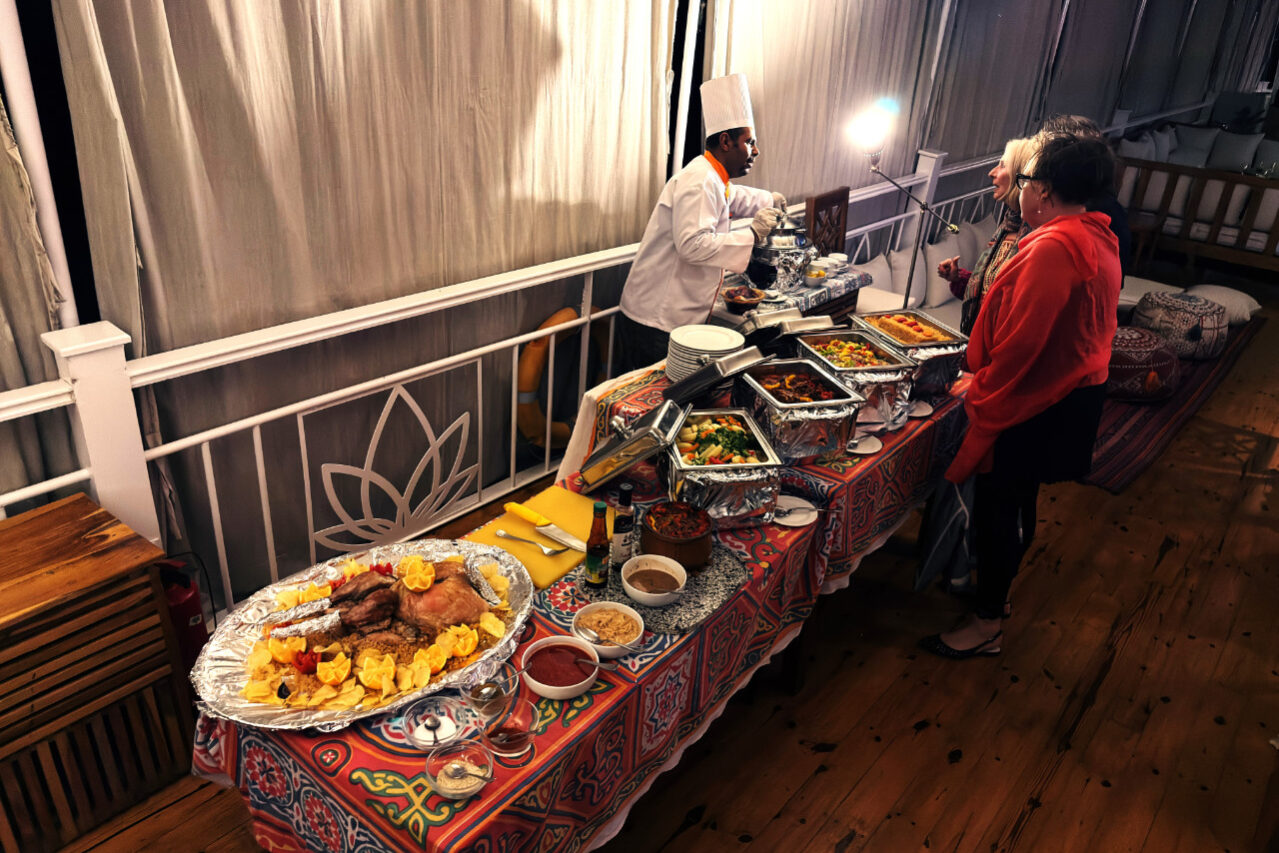 Imagine this: a gentle evening breeze, the golden hues of the setting sun reflecting on the Nile’s tranquil waters, and the rhythmic sound of the river. Now, picture yourself seated on the open deck of a traditional dahabiya, surrounded by the aroma of freshly prepared Egyptian cuisine, ready to indulge in a feast of flavors. Dining on deck while sailing the Nile is more than just a meal—it is an experience that blends history, nature, and culture into every bite.