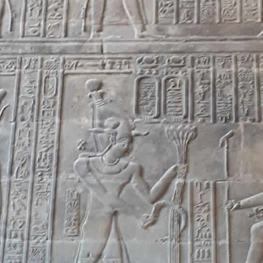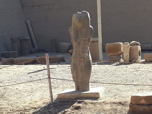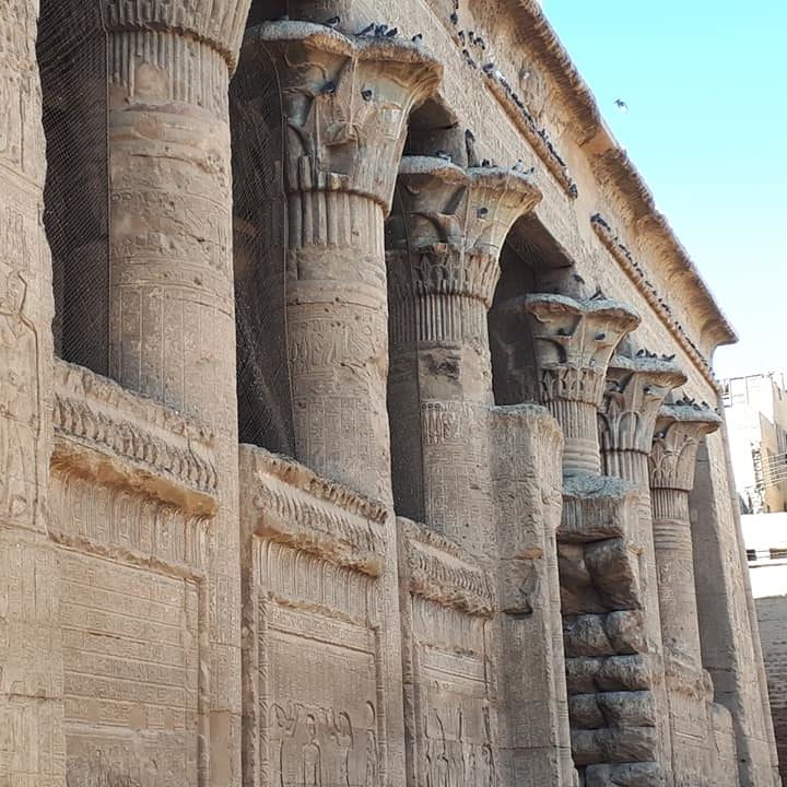 But we will not disturb those farmers today – instead, from the wide open and busy boulevard flanking the river we will nip into an enticing, shaded alley – and into a completely different, much older world.As we emerge again into the sunlight at the ancient heart of Esna, a mighty temple greets us, sunk deep in an excavation pit surrounded by old houses with beautifully carved wooden `mashrabeeya` balconies. As we look down, history is looking right back up at us. This is only the first part of the temple of the great ram’s-headed God Khnum, the Divine Potter who formed the bodies of mankind on his potter’s wheel. It is dedicated to him, his consort here the Goddess Menhyt, their son Heka, and also to the fierce warrior Goddess Neith. There is a lovely statue of Menhyt still standing in the open courtyard, which always exerts a draw on visitors. Perhaps they can still feel the powers of ages past through this black basalt figure…