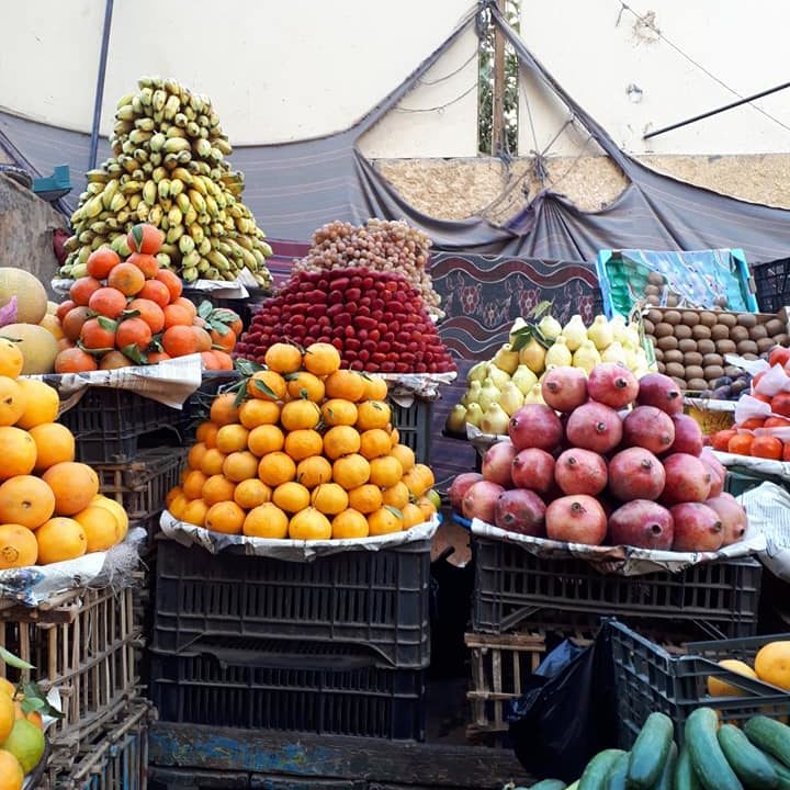 One layer up, the temple is surrounded by medieval alleys and the scents and sounds of the local souk that still thrives there today. Let’s take a stroll through this wonderful market. Here, we see the fruits of the labors of the busy farmers, quite literally. Let’s feast our eyes on the vibrant colors of the fresh fruits and vegetables for sale, often stacked up in immaculate pyramids, fill our noses with the scents of the spices heaped in baskets all around us, admire the age-old copper work and the beautifully carved medieval doorways with signs of both Coptic and Islamic inhabitants. One of the oldest Coptic churches and one of the oldest mosques in Egypt are hidden in this warren of wondrous alleys – let’s see if we can find them!
